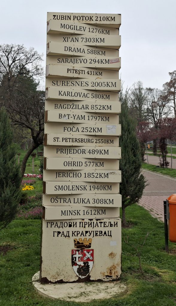 На улазу у Велики парк, у једном од најпосећенијих крагујевачких шеталишта већ више година стоји путоказ са именима и километражом до градова побратима и градова и општина са којима Крагујевац има пријатељску сарадњу, тј. са којима на основу потписане Повеље сарађује. Град иначе остварује међународну сарадњу са преко 30 градова, а прва Повеља о братимљењу потписана је 1967. године са француским градом Сиреном који у Крагујевцу има и своју улицу.